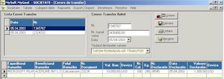 Cerere de Transfer Programul afiseaza o fereastra ce contine 3 sectiuni: Lista Cereri Transfer, Antet Cerere Transfer, Detaliu document care contine liniile referitoare la articolele ce fac obiectul documentului selectat. In jumatatea de sus a ecranului in partea dreapta, se afla butoanele de comanda care asigura gestionarea documentelor, respectiv, Creare, Salvare, Listare, Stergere, Iesire.